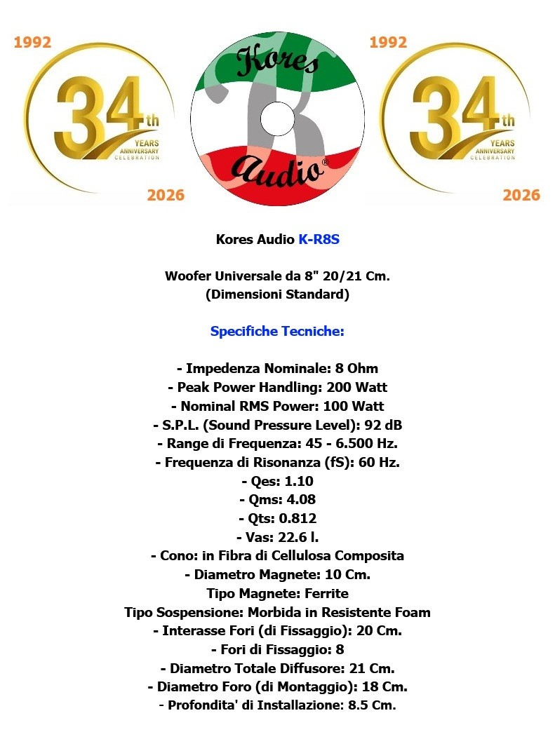 Kores Audio K-R8S Woofer Universale 8" Pollici 20/21 Cm 8 Ohm 200W Professionale